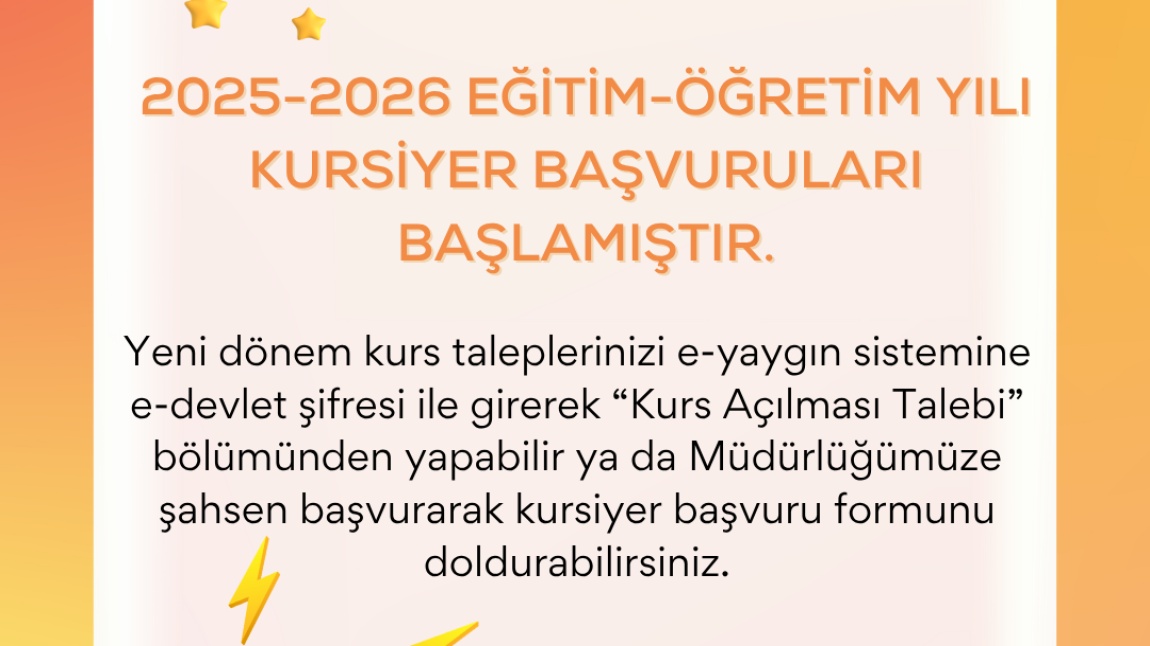2025-2026 eğitim-öğretim yılında katılmak istediğiniz kurslar için kursiyer başvurularınızı; e-yaygın sistemine e-devlet şifrenizle girerek "Kurs Açılması Talebi" bölümünden yapabilir ya da Müdürlüğümüze şahsen gelerek kurs başvuru formunu doldurabilirsiniz.